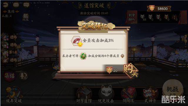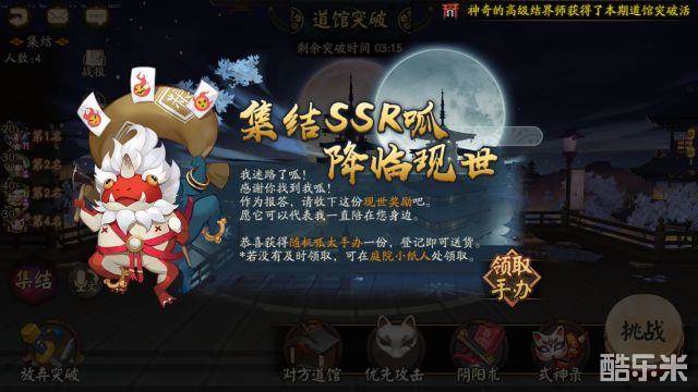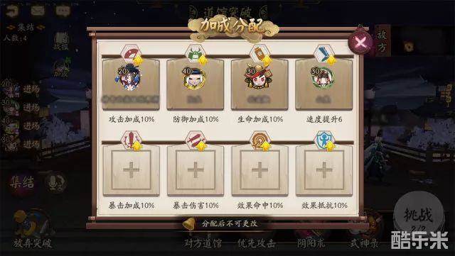 8个幸运加成将由采办者,分配给8个参与突破的寮成员。被分配加成的阴阳师们,点击集结场景中出的小纸人,即可查看所获得的加成效果。