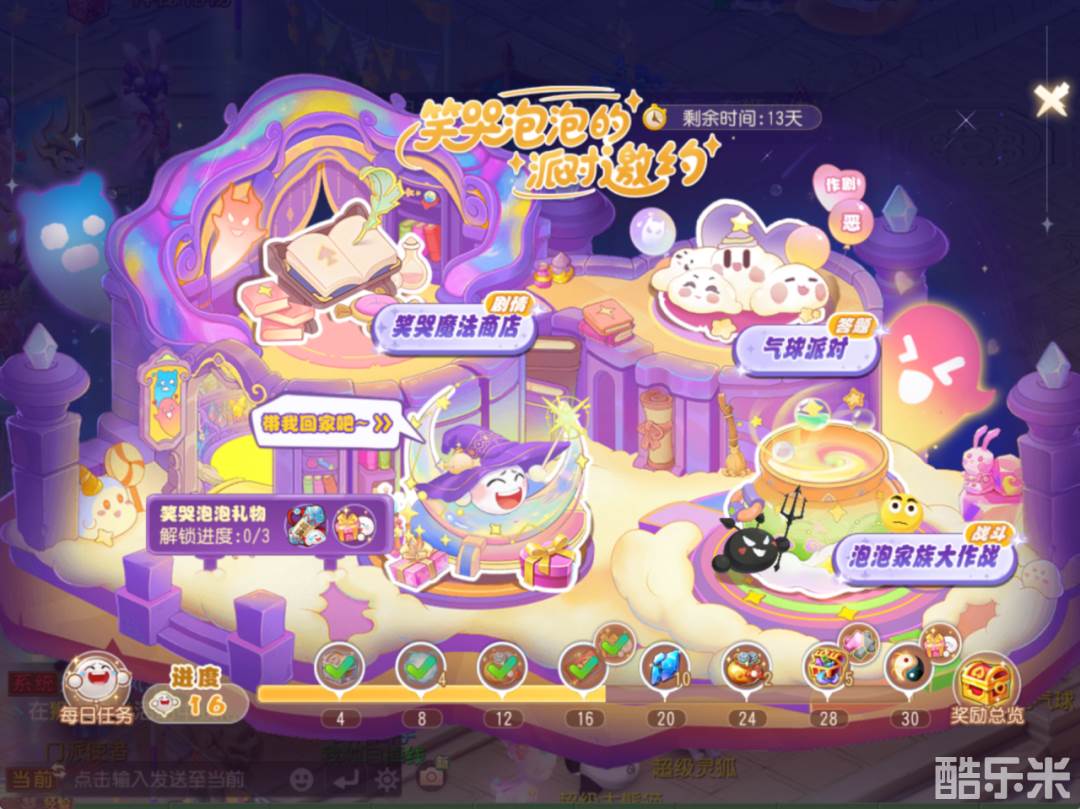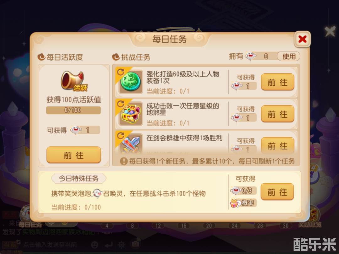 此外,还有“今日特殊任务”助力少侠们加快进度。该任务多为携带笑哭泡泡击杀怪物、通关副本等简单挑战,通过这类活动可至多获得3点进度奖励。