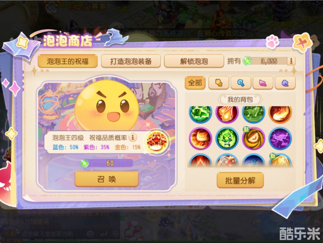 其次可以抽取泡泡王的祝福:在泡泡王商店可消耗泡泡能量抽取泡泡王的祝福,按照金色——紫色——蓝色——绿色的优先度装配,物理型增益配置给超级泡泡、恶魔泡泡,法术型增益配置给法系泡泡。